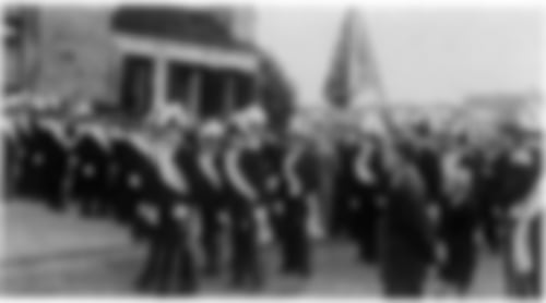 1951: Nach der Fahnenweihe zum Jubiläumverlassen die Schützen die St. Otger-Kirche