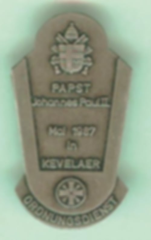 Das Schützenfest 1987 startete mit dem Schwung aus dem Jubiläumsjahr und so fanden sich zum Jahresauftakt 120 Schützen zum St. Sebastianusfest ein. Im Februar wurde unter dem Motto „Herz ist Rumpf“ ein großartiges Kappenfest in der Stadthalle gefeiert. Im April fand turnusgemäß die Generalversammlung statt, bei dem auch erstmals der Antrag der Schützenbrüder Otger Hessing und Hans Pohlmann auf eine Feier in einem Festzelt diskutiert wurden. Ein besonderes Ereignis im Jahr 1987 war der Besuch von Papst Johannes Paul II. in Kevelaer. Für den Ordnungsdienst hatten sich einige Offiziere und Vorstandsmitglieder bereit erklärt. Auch unsere Fahnenschwenkergruppe und die Fahnenabordnungen nahmen an diesem unvergesslichen Papstbesuch teil und erhielten als Dank eine eigens dafür entworfene Plakett. Beim Schützenfest am letzten Juniwochenende gelang es unserm Geschäftsführer Alfons Resing mit dem 195. Schuss, den Vogel von der Stange zu holen. Nur am Rande sei erwähnt, dass auch unser Vorsitzender Hermann Völker starke Ambitionen auf den Vogelschuss hatte, die Organisatoren aber Alfons Resing diese Ehre aus vollem Herzen gönnten. Am Sonntagmorgen fand auf dem alten Friedhof an der Klosterstrasse eine Hl. Messe mit allen Schützen statt, anschließend ging es zum Marktplatz, zum Empfang durch die Vertreter der Stadt, Fahnenschlag, Parade und Marsch zum Frühschoppen in der Stadthalle. Am Abend erschien diese Stadthalle für die vielen Gäste schon zu klein zu sein, denn der Tanzabend war außerordentlich gut besucht und wurde, wie seinerzeit üblich, mit einer bunten Polonaise zum Marktbrunnen unterbrochen. Auf dem Schützenfest wurde der Fahnenoffizier Gerd Horstmöller nach jahrelangem aktivem und vorbildlichem Dienst mit allen Ehren aus dem aktiven Dienst verabschiedet.
