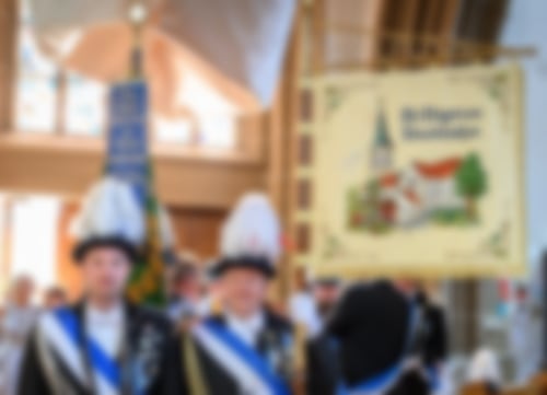 Zur Standarte wurden neben der Stange aus Edelholz mit Bajonettverschluß noch der Standartenträger, der Tragegurt mit Köcher und die Fahnenhülle geordert. Insgesamt gesehen wurden die besten Materialien gewählt. Leider wird uns die Standarte deshalb wahrscheinlich alle überleben. Unsere mit der Beschaffung befassten Schützenbrüder Alfons, Berni und Helmut waren richtig richtig stolz, als sie am 21. Juli 2001 das gute Stück bei Weyer in Empfang nehmen konnten! Am anläßlich des Jubiläums "50 Jahre Mitgliedschaft im Bund der Historischen Deutschen Schützenbruderschaften" am 22.+23.09.2001 veranstalteten Jubiläums-Schützentag wurde die Standarte im Festgottesdienst am Samstag feierlich geweiht. Am Sonntag wurde sie beim Festumzug der gesamten Bevölkerung präsentiert. Im Jahre 2002 wurde zu dieser Standarte ein weiterer, längerer Fahnenstock beschafft, der es erlaubt, die Standarte auch hoch zu Pferde zu tragen, ohne dass sie dem Reiter die Sicht beinträchtigt!